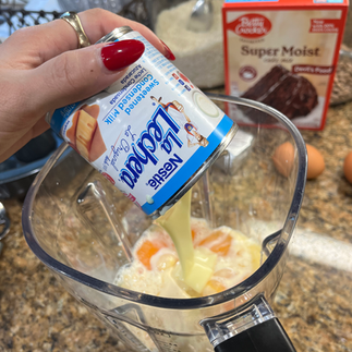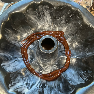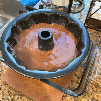 ¡Ya que está encima tu molde del traste, es tiempo para la magia del chocoflan! Vas a poner la mezcla del flan adentro del molde. Igual en vueltas para que todo esté parejo y no mueva la cajeta. ¡Se va a hundir la mezcla y te vas a asustar, pero así debe de pasar! ¡No te preocupes!
